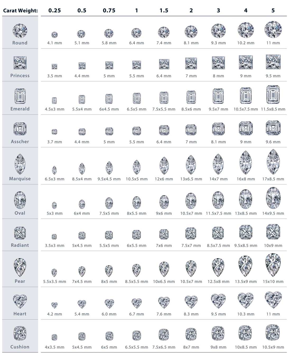 Carat Weight is the unit of weight for the diamond. A carat is further subdivided in 100 points ( 0.01 carat = 1 point ). One carat is equal to 100 points or 0.20 grams. The value per carat increases with carat size, because larger rough diamonds occur less frequently. In other words, 2 half-carat diamonds taken together will not cost as much as 1 one-carat diamond, as the one-carat stone is more rare and will cost more. A diamond's weight might not necessarily reflect proportionately to its look. That is because of the way they are cut. A 1 carat diamond with a smaller table and longer pavilion with look relatively smaller in size than a 1 carat diamond with a flatter or larger table and shorter pavilion. An ideal cut diamond shows the best size and proportion in comparison to a shallow or deep cut.