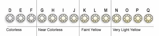 Color describes the amount of yellow tint the diamond contains, or lack thereof. This can range from colorless to yellow with slight tints of yellow, gray or brown. Colors can also range from intense yellow to brown, blue, green, pink and red. These fancy colors are rare and therefore more valuable. A color grade of D is the highest possible, while Z is the lowest and most yellow. Milano sells diamonds with a color grade of J or higher. The less color a diamond has, the higher its color grade. Color is usually the next most important characteristic when selecting a diamond after cut. Below is chart which shows you the different color grades and their meaning: