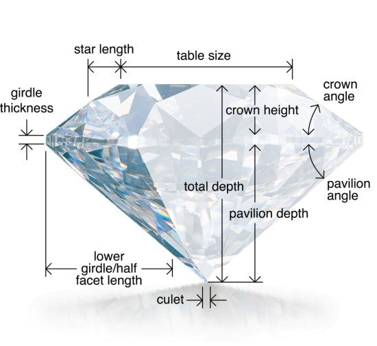 The proportions displayed by the stone are very significant. Two of the key factors in the grading of cut quality -- table percentage and depth percentage -- are usually expressed on grading reports.